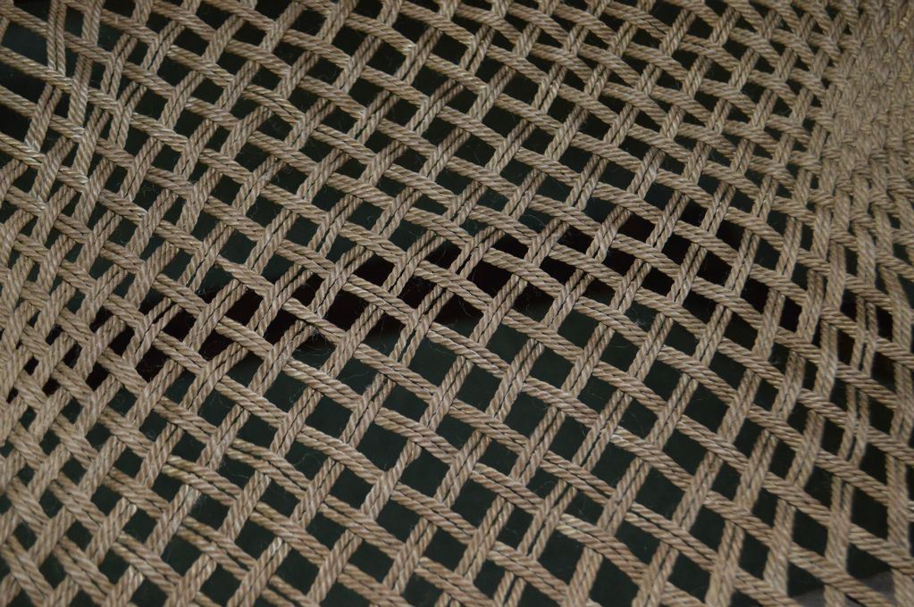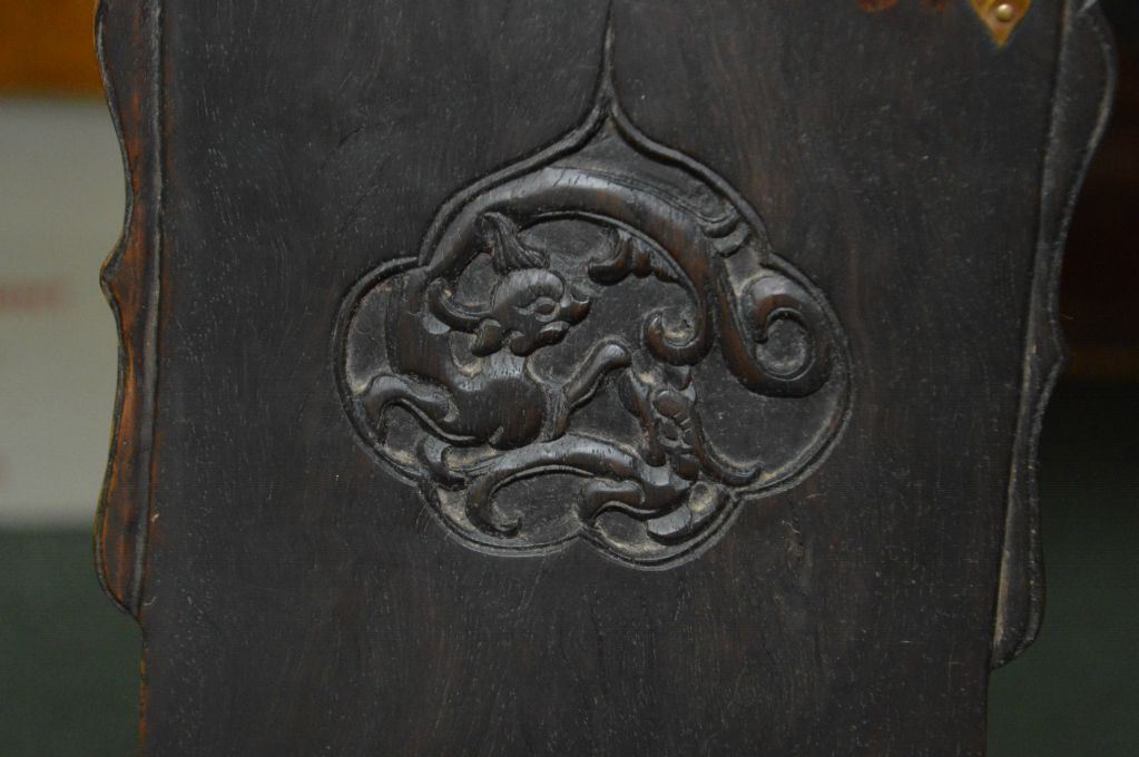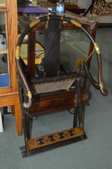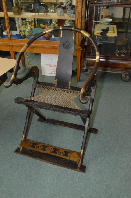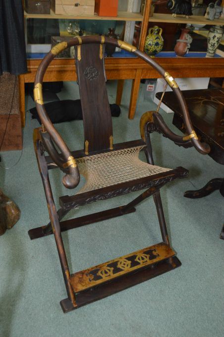 A pair of Huanghuali Chinese hunting chairs with woven rope seats and brass acccents