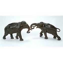 A pair of Japanese bronze figures of striding elephants, each beast naturalistically modelled and...