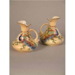 A pair of Locke & Co. blush ewers, decorated with peacocks 4.25in....