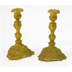 A pair of Louis XV design ormolu candlesticks, with baluster stem and base cast with scrolling acanthus 8ins £100-150