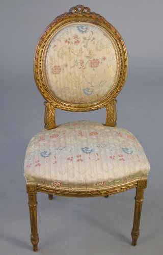 A pair of Louis XVI design carved giltwood salon chairs, with tied ribbon crest rails on turned and fluted legs £150-200