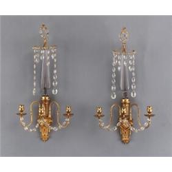 A pair of Louis XVI ormolu three-light BRAS DE LUMIÈRE, with pendants, 67 cm high; fitted for suspension on wall, later pendants