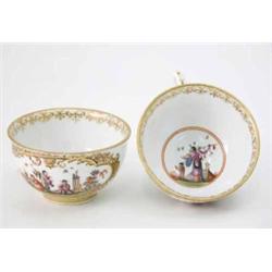 A pair of Meissen teacups probably painted by Metzsch with panels of chinoiserie figures at vario...