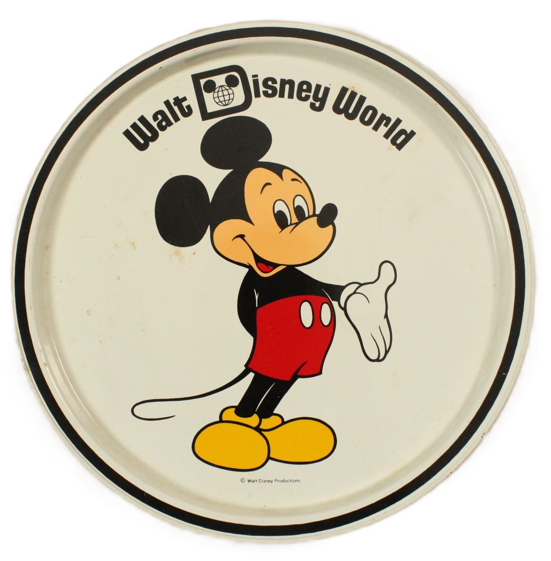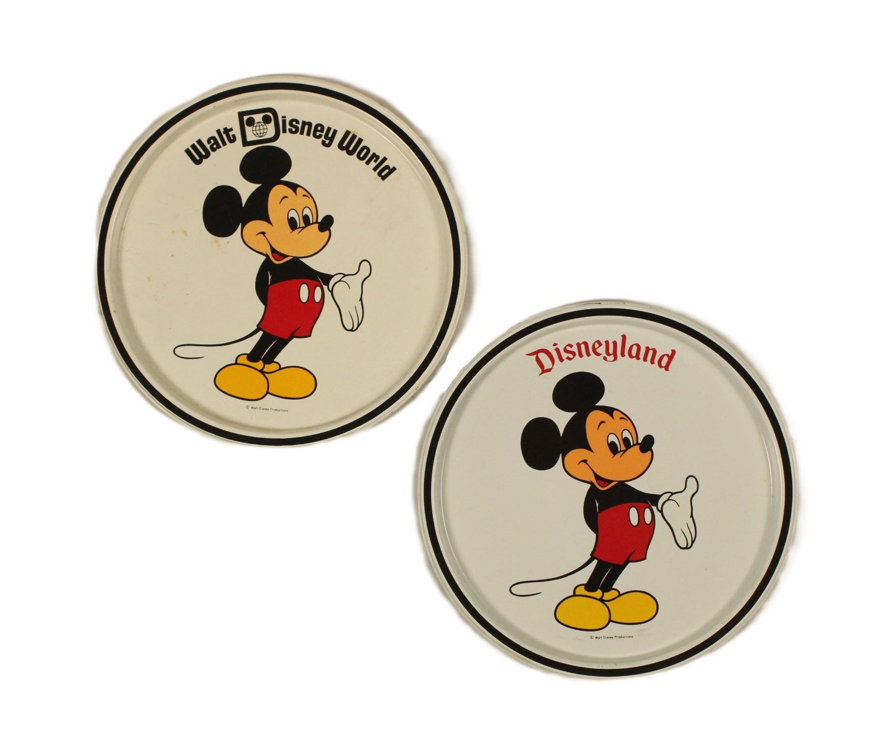 (Disney Parks) Here are two round white metal souvenir trays from the parks. Both are identical in featuring classic Mickey Mouse with a black border, but one says Walt Disney World and the other says Disneyland. Both are in good condition with scratches, edge wear and staining from age and use. The measure 10.75" across.