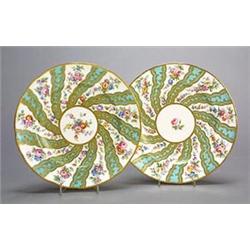A pair of Minton plates painted in the Sevres style with alternate bands of sprays of flower and turquoise-ground strips gilt with C-scroll foliage, radiating spirally from a central circular flower reserve, gilt dentil rims, 23.5cm, mid 19th century, one with puce mark (see illustration) £200-300