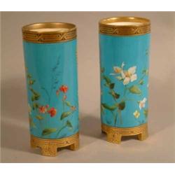 A pair of Mintons porcelain cylinder vases, painted with field flowers on a turquoise ground. Restored 7.5in. £200-300