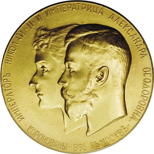 <B>A pair of Nicholas II and Alexandra silver and gold Coronation medals 1896,</B></I> both with Conjoined busts left/Imperial eagle, both are 51.5 mm, the gold is 103.30 gm, both are XF-AU, the gold with a rim bump at 5 o'clock, Smirnov-1101a, the silver with a large reverse rim bump at 3 o'clock. Rare.<BR><BR><b>Shipping:</b> Coin/Currency (<a target="_blank" href="http://www.heritageauctions.com/common/shipping.php">view shipping information</a>)