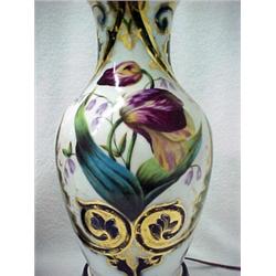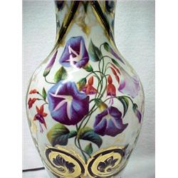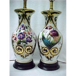 A pair of Old Paris porcelain lamps, vase shape with brass fitting on wooden base, hand painted floral, leaf and swirl decoration, 16 1/2" high to top of porcelain Estimate 200/400