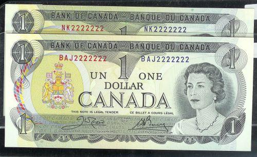 A pair of One digit "SOLID" numbered RADAR note "NL, BAJ 2222222" $1 1973 BC-46a and BC-46b both notes are Gem uncirculated
