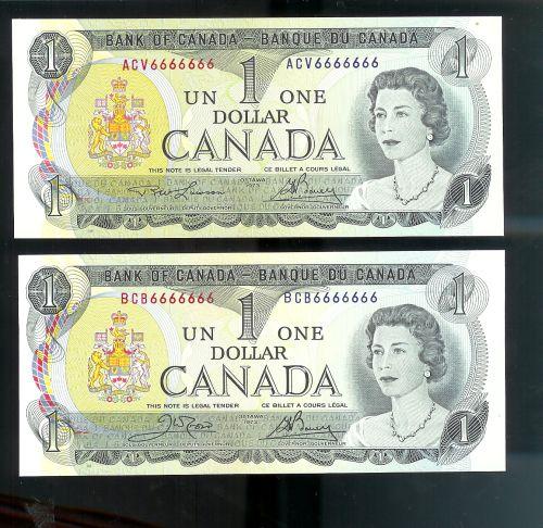 A pair of One digit "SOLID" numbered RADAR note "ACV, BCB 6666666" $1 1973 BC-46ai and BC-46b both notes are Gem uncirculated