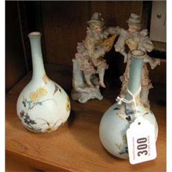 A pair of Oriental bird pattern porcelain vases and a pair of Continental figurines.
