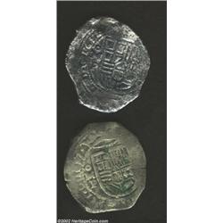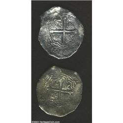 A pair of Philip IV cob 8 reales as follows: 1657 Mo-P, KM45, F.VF with a nice full date; and a 1652 Mo-P, KM45, sea salvaged with light corrosion, Fine. 2 coins Important notice: We expect to be auctioning lots at the rate of 200-250 per hour. Sometimes eBay Premier live bid software cannot keep up with that pace, so we strongly recommend that you place a realistic proxy bid now as insurance to avoid disappointment. Also please note that all Heritage/CAA lots purchased through eBay Premier carry a 20% Buyer's Premium. Please make sure you read the Terms and Conditions.