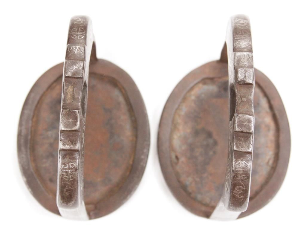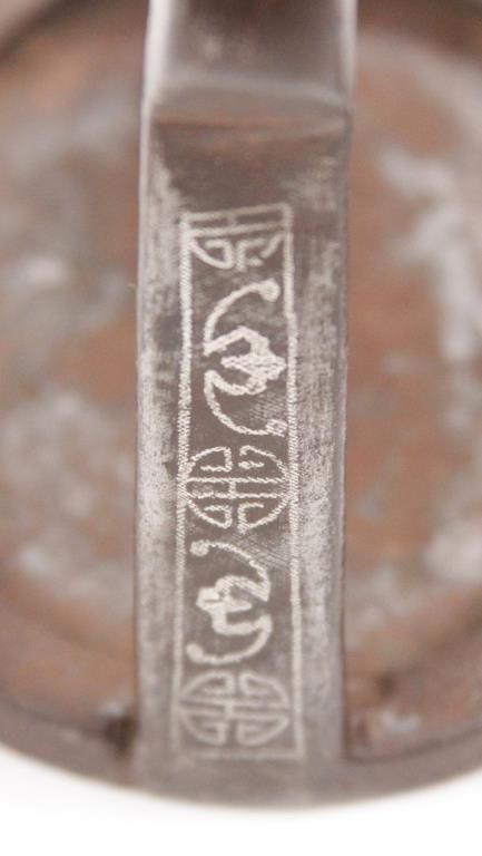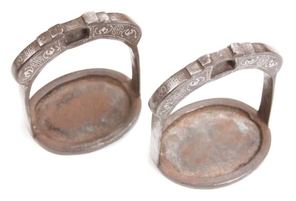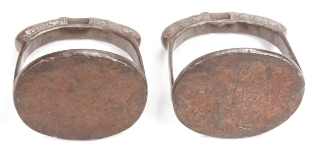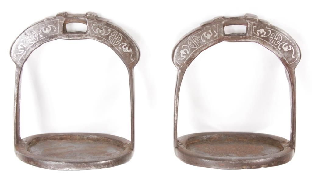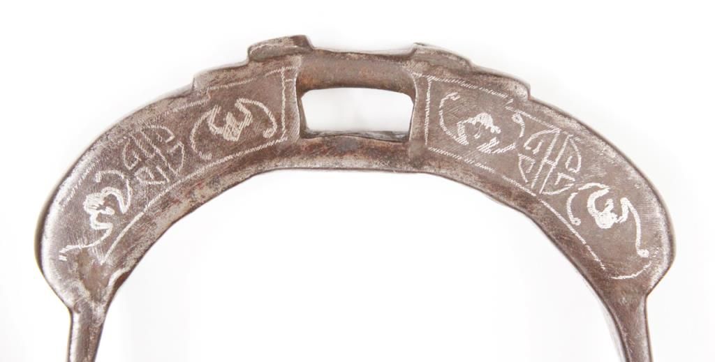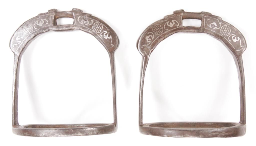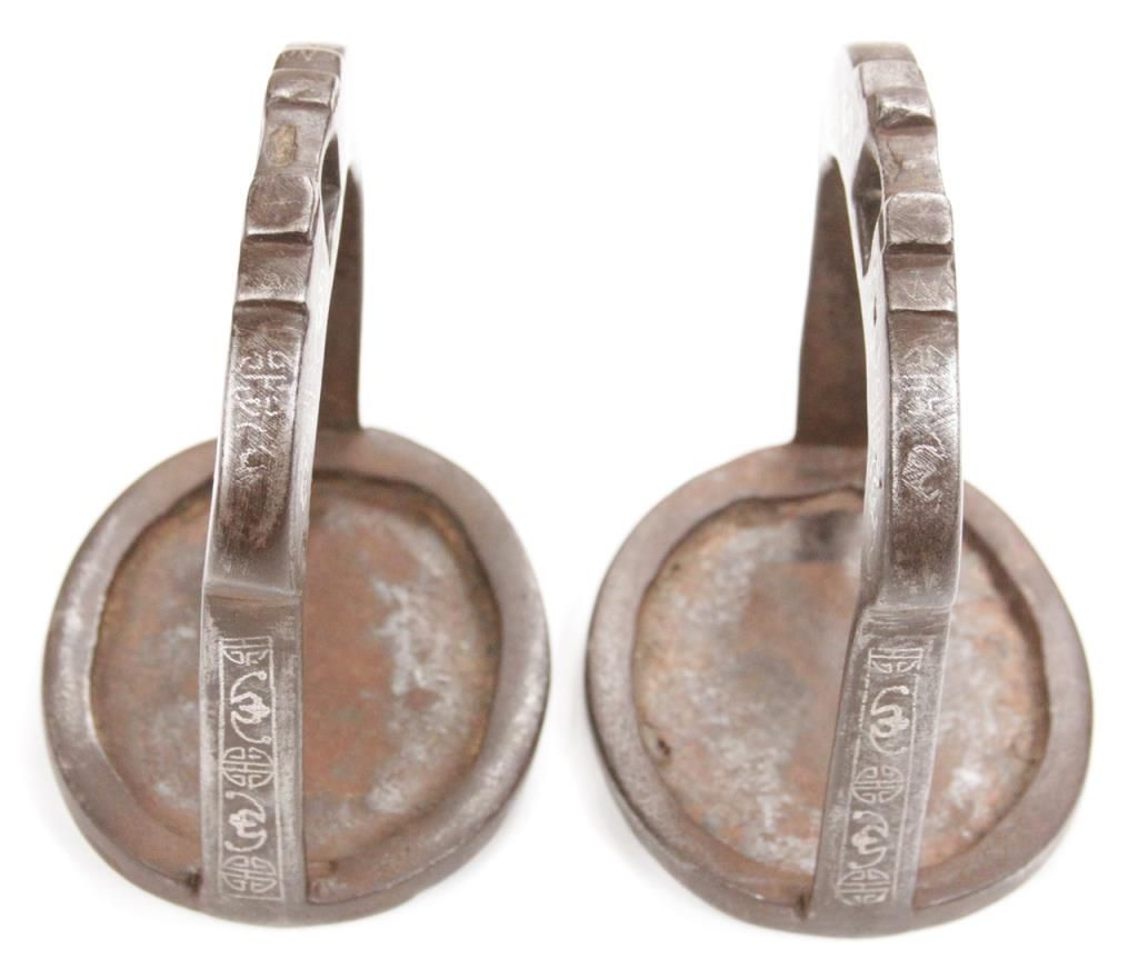A pair of Qing dynasty iron stirrups with silver inlays. Decorated with bats and Chinese symbols. 18th-19th century. Worn with some of silver inlays missing. Measure 6” high. Est.: $250-$350.
