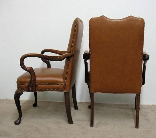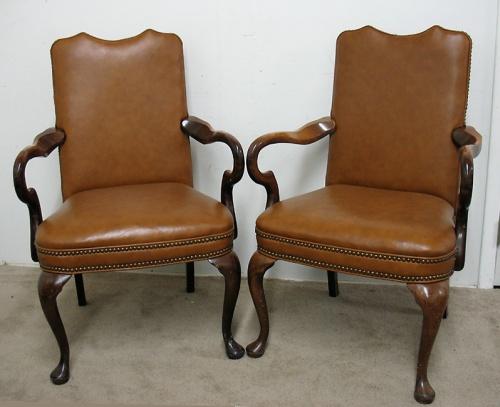 A pair of Queen Anne style leather and cherry open armchairs by Hickory Leather Co.; formed crest with brass tacks; light brown leather back and seat; double row of brass tacks on seat rail; cabriole legs with Queen Anne style front feet; mid to late 20th C.; measures 39" high x 23" across x 23" deep (no visible defects)