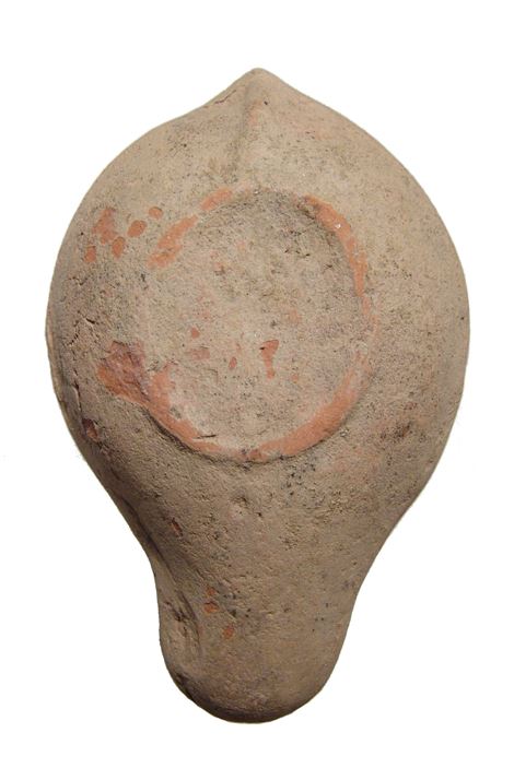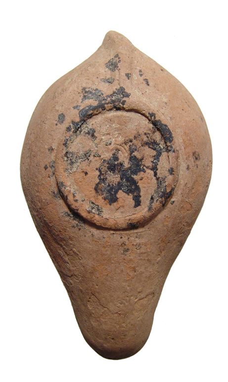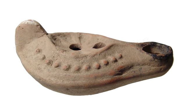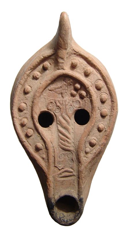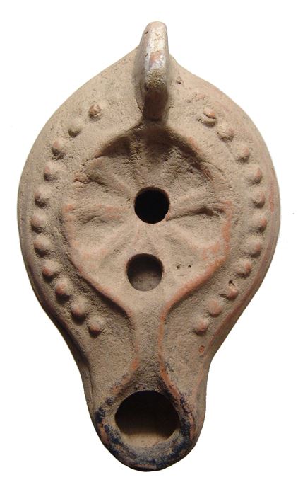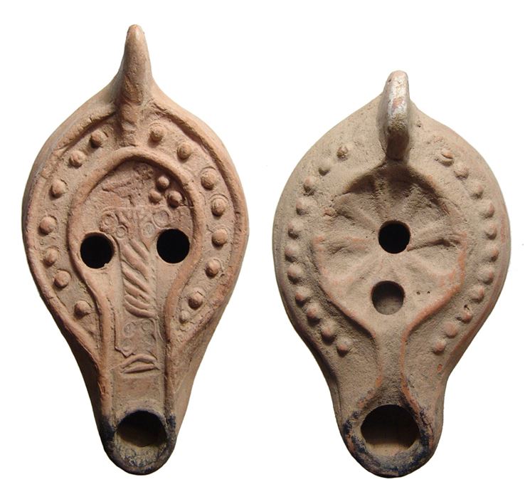 A pair of Roman ceramic lamps. The first is a North African type, c. 4th - 5th Century AD, the flat top with central relief of a bird standing atop a spiral column, berries before, the shoulder with raised pellets and channel on the nozzle, pinched handle at back and ring base on bottom. L: 4 1/5 in (10.7cm). The second lamp, c. 4th Century AD, with rosette within the concave discus, raised pellets around the shoulder and narrow channel on nozzle, pinched handle at back, shallow ring base on bottom. L: 3 3/5 in (9.1cm). Both nice examples with earthen deposits and each show carbon deposits from use in antiquity. Ex New York private collection.