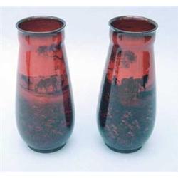 A pair of Royal Doulton flambe vases of tapering rounded form with ogee rim decorated with cattle in a landscape and a ploughing scene, on hardwood stands, 11.5ins (See illustration). £800-1200