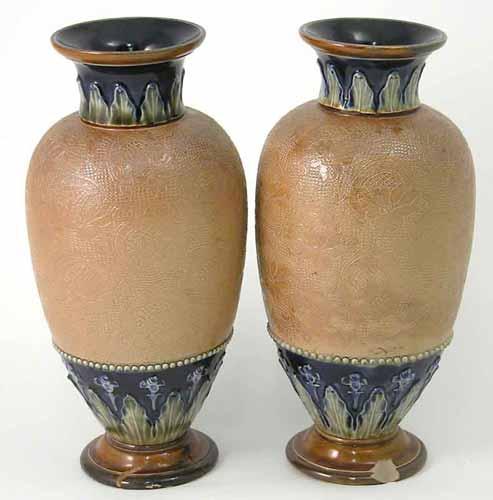 A pair of Royal Doulton stoneware vases, with moulded and incised detail, faults, 11.5in....