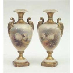 A pair of Royal Worcester vases with scroll handles, the bodies painted with rams, signed G.Barker, patt no.1969, date code for 1921, 6.5ins £800-1200