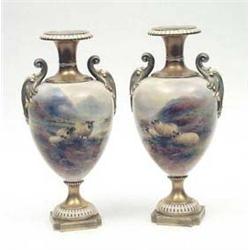 A pair of Royal Worcester vases with scroll handles and painted with highland rams beside lochs, signed H.Davis, patt no.1969, date code for 1914, 12.5ins £3000-4000