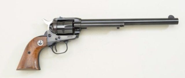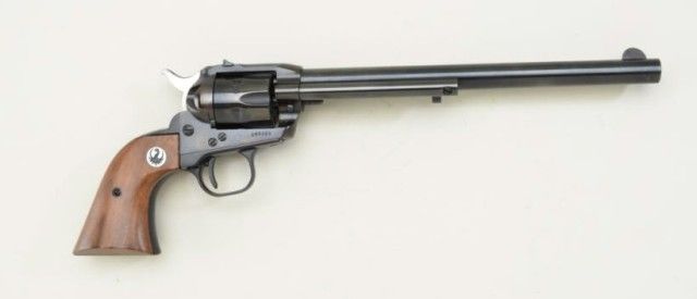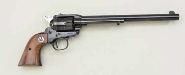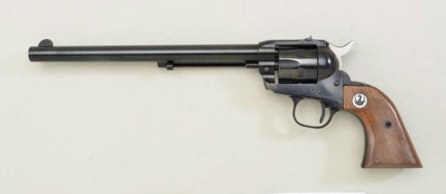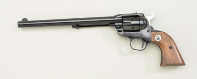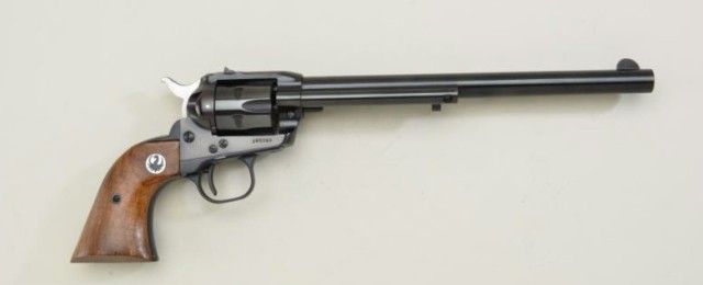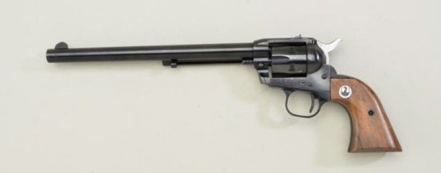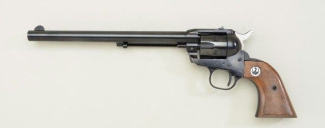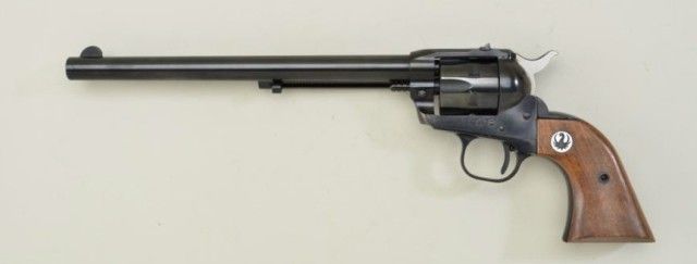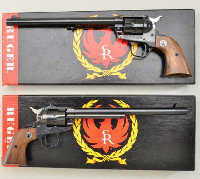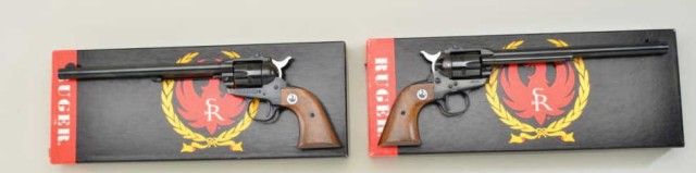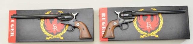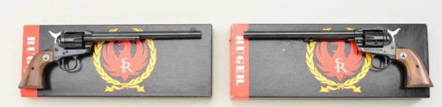 A pair of Ruger single six single action 22 caliber revolvers with 9-1/2" barrels, blued finish standard wood grips, serial #'s 165262 and 165263. Both excellent to near new in original card board boxes. Butterfields tagstill attached when sold as part of Bill Ruger collection. Robert E. Petersen collection. Est.; $800-$1,600.