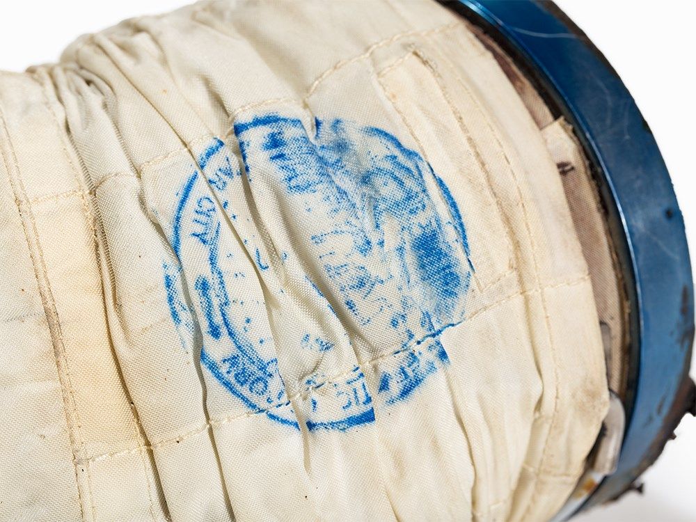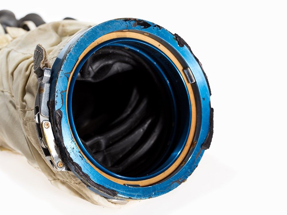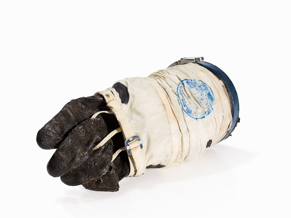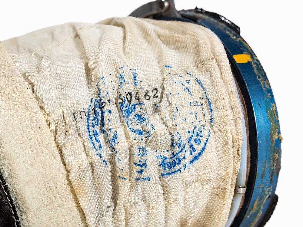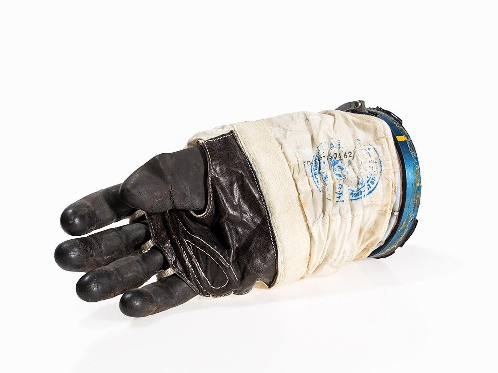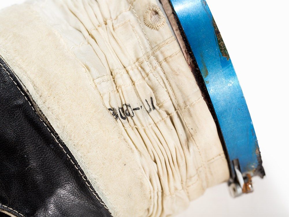This is a pair of original gloves of a Soviet Sokol KV-2 (hawk) pressure space suit. It is crafted of white fireproof nylon fabric with rubberized glove and black leather palms. There is a white horizontal velcro below the palm. Inside is a stiff rubber ‘accordion’ wrist. At the lower end is still the original aluminum ring in place to bolt the glove to the arm of the Sokol KV-2 space suit. The Sokol space suit was worn by all cosmonauts on board of the Soyuz spaceship at launch, landing and docking maneuvers. It came into use for the first time in 1973 on a flight to the Russian space station MIR and is until today in use by the Russian aeronautics.
