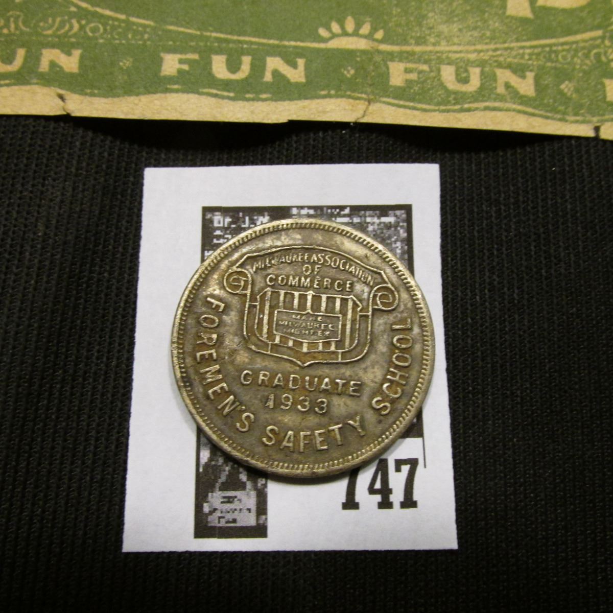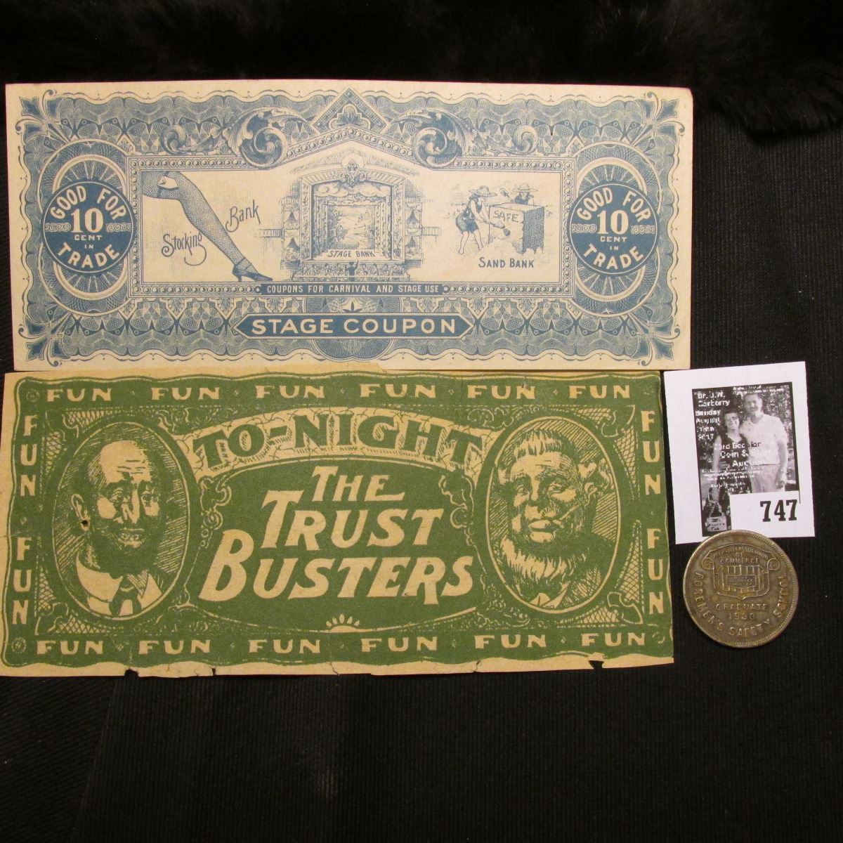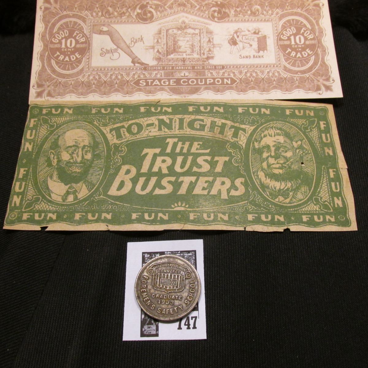 A pair of Satirical Banknotes "To-night The Trust Busters" & "Good For 10 Cent in Trade…Stage Coupon"; and "Milwaukee Association of Commerce Graduate 1933 Foremen's Safety School", "Universal Safety Country Home Self" medal.