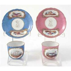 A pair of Sevres-style cabinet cups and saucers painted with gilded bird panels, one against a rose-pink ground, the other against a celeste-blue ground, mock-Sevres marks, cups 2in. high £80-100