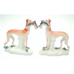 A pair of Victorian Staffordshire whippets, each holding rabbit in mouth, on moulded bases, 7.5ins £150-200
