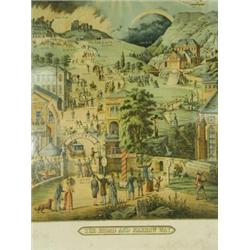 A pair of Victorian 'Temperance Society' (?) coloured prints 'The Broad and Narrow Way' and 'The Up and Down Lines' each maple framed, 47 x 37cm Est. 200/300
