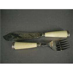 A pair of Victorian fish servers with engraved plated blades, ivory handles and silver finials Est. 60/80