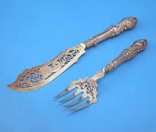 A pair of Victorian pierced silver fish servers, with engraved foliate decoration and neo-rococo handles, maker George Unite, Birmingham 1872, 12ins £100-150