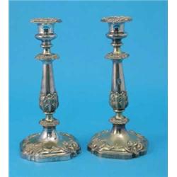 A pair of Victorian plated candlesticks, each decorated throughout with acanthus leaves and flora...