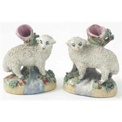 A pair of Victorian sheep and ram spill vases standing on oval cushion bases, 3.5in. £60-80