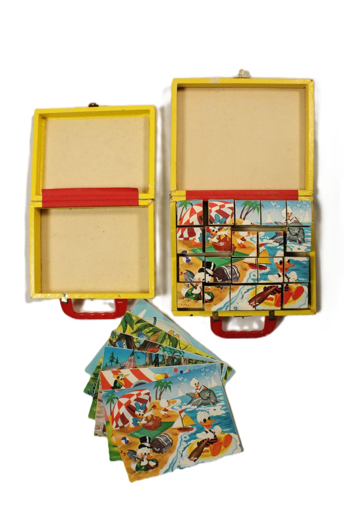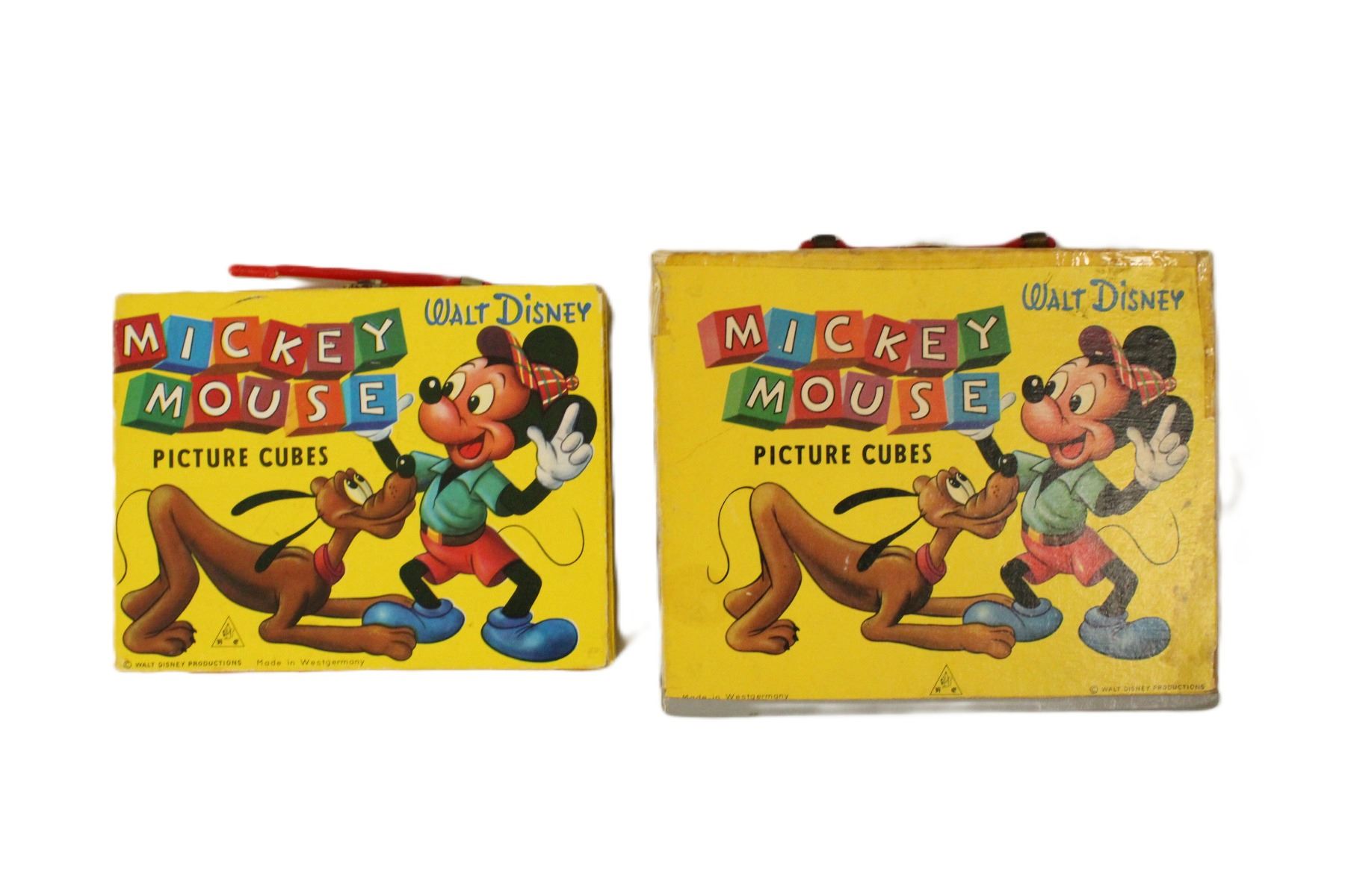 A larger and smaller Walt Disney's Mickey Mouse Picture Cubes boxes. Both boxes are not in great shape but the images on the front and side are really great. The large box has all the cubes and picture pages but is in the worst condition.