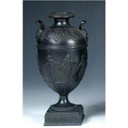 A pair of Wedgwood black basalt vases, the lug handles raised above Pan masks on the shoulders of the ovoid bodies sprigged with oak leaves alternating with anthemion above the 'Dancing Hours', the socle and square foot with further anthemion band, impressed mark, 18cm high (D) (2) £100-150