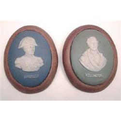 A pair of Wedgwood style jasperware portrait plaques depicting Wellington and Bonaparte in mahogany frames, 4.5ins £70-100