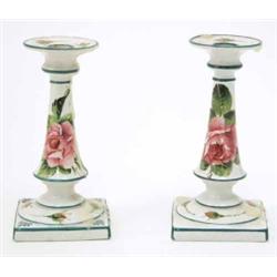 A pair of Wemyss candlesticks, painted with cabbage roses and leaves, on square bases, painted and impressed marks, 7ins £150-250