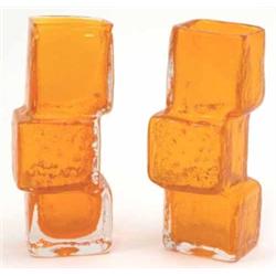 A pair of Whitefriars drunken bricklayer vases, designed by Geoffrey Baxter in textured tangerine coloured glass, circa 1967, 8ins £200-300