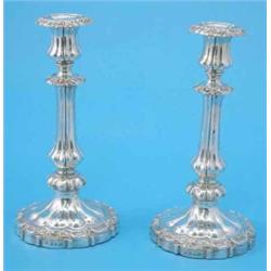 A pair of William IV silver candlesticks, of knopped and fluted form with scroll and shell banding, Makers T.J. & N. Creswick, Sheffield 1833, 9,.5ins. £1,000-1,500