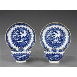 A pair of Worcester tea bowls and saucers, printed with bridge and boat in blue within a gilt line border, disguised numeral mark (4)