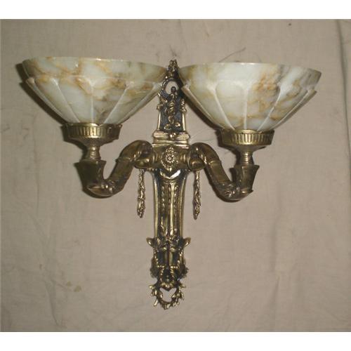 The artwork of the cast bronze of this pair of alabaster stone sconces make this item unique.Shipping cost within USA: 75.00. Some assembling may be required. They were rewired to USA standards.Due to the nature of alabaster stone the pictures may not accurately represented the color and pattern of the alabaster.