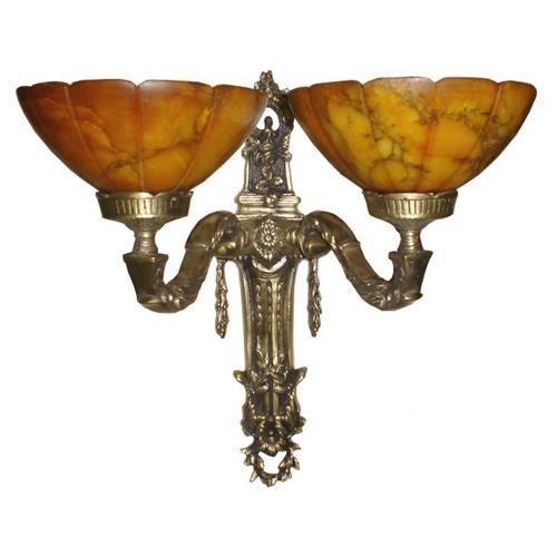 The artwork of the cast bronze of this pair of alabaster stone sconces make this item unique.Shipping cost within USA: 75.00. Some assembling may be required. They were rewired to USA standards.Due to the nature of alabaster stone the pictures may not accurately represented the color and pattern of the alabaster. It will take 4 to 5 weeks to deliver.