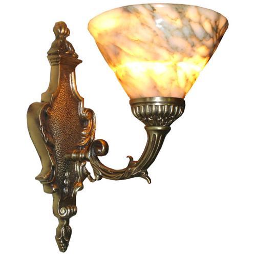 The artwork of the cast bronze of this pair of alabaster stone sconces make this item unique.Shipping cost within USA: 75.00. Some assembling may be required. They were rewired to USA standards.Due to the nature of alabaster stone the pictures may not accurately represented the color and pattern of the alabaster. It will take 4 to 5 weeks to deliver