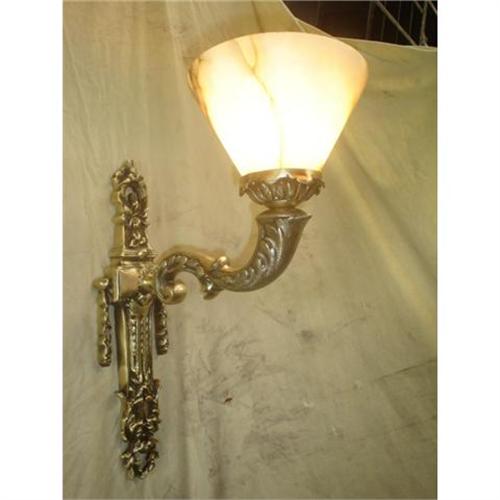 The artwork of the cast bronze of this pair of alabaster stone sconces make this item unique.Shipping cost within USA: 75.00. Some assembling may be required. They were rewired to USA standards.Due to the nature of alabaster stone the pictures may not accurately represented the color and pattern of the alabaster.It will take 4 to 5 weeks to deliver.