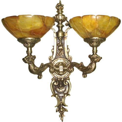 The artwork of the cast bronze of this pair of alabaster stone sconces make this item unique.Shipping cost within USA: 75.00. Some assembling may be required. They were rewired to USA standards.Due to the nature of alabaster stone the pictures may not accurately represented the color and pattern of the alabaster.It will take 4 to 5 weeks to deliver.