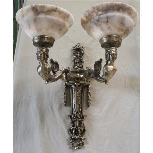 The artwork of the cast bronze of this pair of alabaster stone sconces make this item unique.Shipping cost within USA: 75.00. Some assembling may be required. They were rewired to USA standards.Due to the nature of alabaster stone the pictures may not accurately represented the color and pattern of the alabaster.It will take 4 to 5 weeks to deliver.