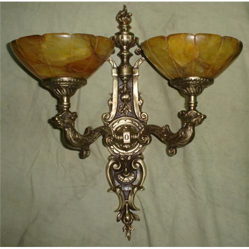 The artwork of the casted bronze of this pair of alabaster stone sconces make this item unique.Shipping cost within USA: 75.00. Some assembling may be required. They were rewired to USA standards.Due to the nature of alabaster stone the pictures may not accurately represented the color and pattern of the alabaster. It takes 4 to 5 weeks to deliver