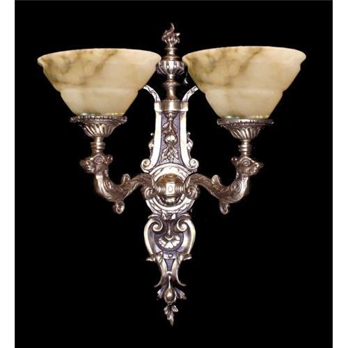 The artwork of the casted bronze of this pair of alabaster stone sconces make this item unique.Shipping cost within USA: 75.00. Some assembling may be required. They were rewired to USA standards. Due to the nature of alabaster stone the pictures may not accurately represented the color and pattern of the alabaster.