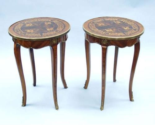 A pair of antique French Louis XVI style marquetry inlaid circular fruitwood lamp tables with bronze mountings. Each raised on slender cabriolle legs. 18" diameter, 24 1/2" high. 4000-5000 PR