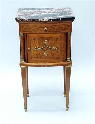 A pair of antique French transitional style burl walnut inlaid mahogany lamp commodes with marble top. Frieze with a drawer over closed cupboard. Raised on long tapered legs mounted with thimble sabots. Each 17 1/2" wide, 14" deep, 33" high. 1800-2200EA